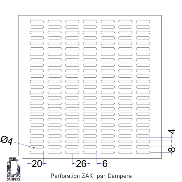 La tôle perforée LR 4x20 U 8x26 - Zaki DAMPERE est conçue pour offrir une solution efficace et esthétique dans le domaine de la ventilation. Avec ses trous oblongs de 4x20 mm disposés selon une grille orthogonale LR 4x20 U 8x26, cette grille perforée présente un design classique et épuré qui s'intègre facilement dans divers environnements.