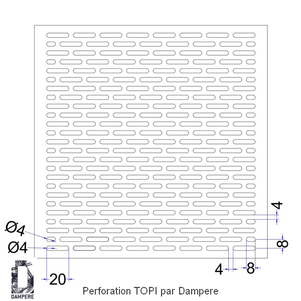 La tôle perforée LR 4x20 Z 8x24 - Topi est conçue avec des trous oblongs de 4x20 mm, disposés horizontalement selon un motif standard en moucharabieh fin. Ce design lui confère une esthétique moderne et épurée, où les bordures parfaitement achevées ajoutent une touche de finesse et de sophistication. Le maillage homogène ainsi créé offre une visibilité tout en garantissant une certaine intimité, ce qui en fait un choix idéal pour divers projets architecturaux en restant économique. L'effet visuel de la tôle perforée LR 4x20 Z 8x24 - Topi est à la fois dynamique et subtil, permettant à la lumière de filtrer à travers ses perforations classiques tout en projetant des ombres délicates sur les surfaces environnantes. Cette interaction entre les zones pleines et ajourées enrichit l'espace, créant un jeu de lumière qui évolue au fil de la journée. La structure alvéolaire permet également une circulation d'air efficace, ce qui est essentiel dans les applications où la ventilation est nécessaire, tout en maintenant une esthétique soignée dans l'architecture urbaine. Dans un cadre urbain moderne, la tôle perforée LR 4x20 Z 8x24 - Topi peut être utilisée pour des garde-corps de balcons, des clôtures décoratives, ou même des habillages de façade, apportant une touche contemporaine aux bâtiments. Elle est également appropriée pour des applications intérieures, telles que des séparateurs d'espace ou des écrans décoratifs, où elle peut servir à créer des ambiances uniques tout en préservant une certaine fonctionnalité. La tôle perforée LR 4x20 Z 8x24 porte aussi la dénomination Lg 4x20 - 8x24 selon la norme. Le prix de la tôle perforée Topi en acier galva ep 1.5 mm de 55€/m² à 70 €/m² pour 100 m² selon les formats de calepinage du projet d'habillage métallique.Usages