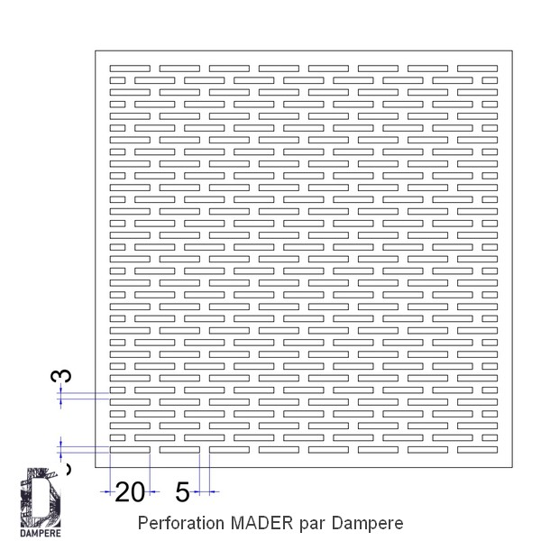 La tôle perforée REC 3x20 Z 6x25 - Mader se distingue par sa conception raffinée, mettant en avant des trous rectangulaires de 3x20 mm disposés en quinconce. Cette disposition crée une grille fine et régulière, identifiée par la référence REC 3x20 Z 6x25, qui offre une esthétique à la fois moderne et élégante. Les bordures parfaitement définies ajoutent une touche de précision et de qualité à l'ensemble, soulignant l'artisanat et le soin apportés à sa fabrication.