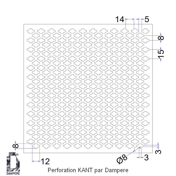 La tôle perforée décorative Kant DAMPERE présente un motif unique et sophistiqué, où se rencontrent deux éléments géométriques complémentaires. Un maillage de croisillons en diagonale se superpose à une résille en croix ondulée et fluide, créant un effet visuel à la fois structuré et organique. Ce jeu de superpositions et d'entrelacements offre une sensation de mouvement et de légèreté, comme si les croisillons et les ondulations s'enroulaient et se déroulaient avec élégance sur la surface du panneau.