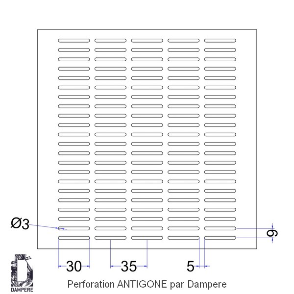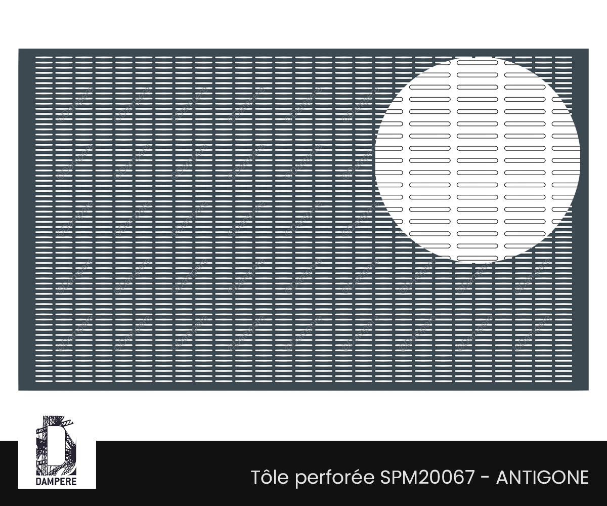La tôle perforée LR3x30 U 9x35 - Antigone DAMPERE se caractérise par ses trous oblongs de 3x30 mm, disposés avec précision selon une grille ajourée orthogonale à 27% de vide. Cette configuration standard offre un motif de perforation régulier, où la prédominance graphique horizontale crée une impression de linéarité et d'allongement visuel. Les ouvertures longues allongées, de type Oblong de longueur 30 mm par un diamètre de 3 mm s'étendent uniformément sur la surface métallique, accentuant la fluidité du design tout en maintenant une esthétique moderne et épurée.
