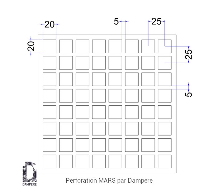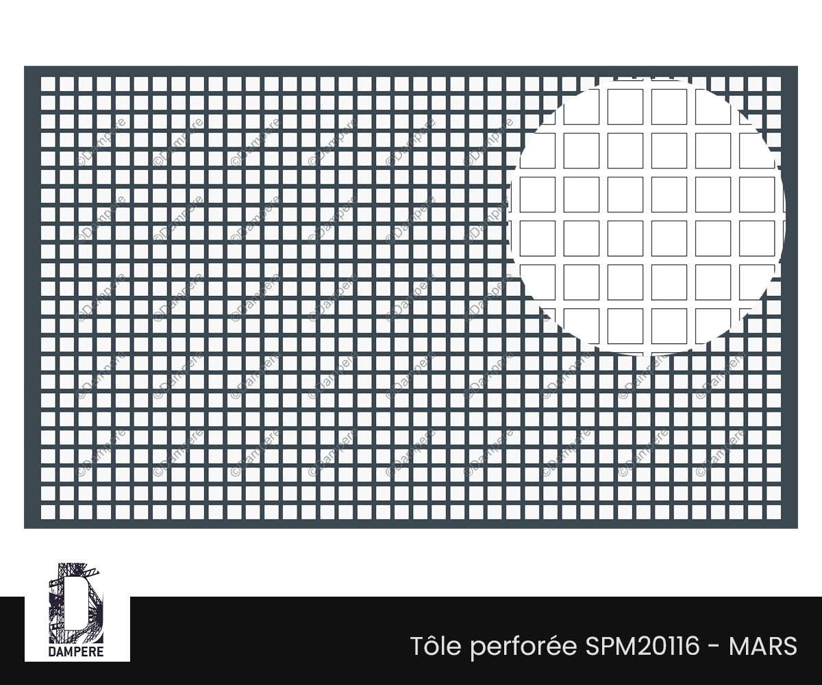 La tôle perforée Mars – C20U25 impose un parti pris franc : une grille carrée serrée, extrêmement respirante, au rendu graphique net et lumineux. Elle est constituée de trous carrés de 20 mm de côté, disposés en alignement orthogonal sur un pas régulier de 25 mm. Référencé Qg20-25, ce motif affiche un taux de transparence élevé d’environ 64 %, la transparence la plus élevée en tôle perforée, idéal lorsque la priorité va à la ventilation des locaux techniques, à la diffusion de lumière et à la légèreté visuelle. La trame en ligne confère à la plaque perforée une lecture purement géométrique, presque pixelisée, très efficace pour rythmer des façades de bâtiment géométriques, créer des filtres de lumière marqués nettement ou alléger visuellement des volumes fermés. Le format carré de 20 mm, répété à intervalle court, crée un maillage métallique dense qui capte le regard de près comme de loin. À la différence des perforations rondes ou en quinconce, le carré en trame droite structure l’espace en une grille régulière et produit des ombres nettes, orthogonales, quasi typographiques. Cet effet graphique franc souligne les projets à langage sobre et contemporain : habillages d’enceintes techniques, grilles de ventilation, caissons d’habillage d’équipements, protections intérieures, bardages secondaires, claustras industriels, plafonds et luminaires protégés. Avec un entraxe de 25 mm pour une ouverture de 20 mm, la matière résiduelle entre deux perforations n’est que de 5 mm. Cette caractéristique confère à la tôle une masse réduite et une grande capacité d’échange air/lumière, mais demande une vigilance accrue sur la tenue mécanique. En formats modestes, la tôle Mars – C20U25 conserve une planéité correcte si l’épaisseur est adaptée ; au-delà, un encadrement périphérique, des plis de raidissement ou une ossature rapportée sont fortement recommandés, surtout en extérieur ou en zone exposée (vent, chocs, vibrations). À titre indicatif, pour des panneaux non encadrés en acier de 1,5 mm d’épaisseur, on privilégiera des surfaces unitaires limitées (environ 0,5 à 0,8 m²) afin de préserver la rigidité et la durabilité. Nous vous conseillons vivement de réaliser des tests mécaniques sur une pièce prototype pour en évaluer sa résistance. Le motif standard C20U25 s’adresse en priorité aux usages qui recherchent transparence et ventilation : écrans de ventilation de locaux techniques, caches pour climatiseurs et groupes froids, habillages aérés pour locaux poubelles (en intérieur couvert), faux-plafonds techniques, cages et protections d’appareillage, cloisons filtrantes dans l’industriel et le tertiaire. Pour des contextes exigeant intimité visuelle forte, sécurité anti-effraction ou surfaces sans ajours agressifs au toucher, on privilégiera des motifs à ajours plus petits, entraxe plus large ou un pourcentage de vide moindre. Côté finitions, l’acier galvanisé Z275 convient à la majorité des usages techniques ; un thermolaquage polyester apportera une protection et une signature esthétique supplémentaires. L’aluminium offrira un gain de poids appréciable sur des panneaux de grande dimension, à condition de renforcer le pourtour. Les inox austénitiques (AISI 304/316) seront retenus pour les environnements humides, salins ou alimentaires. Budget indicatif : en acier galvanisé épaisseur 1,5 mm, la tôle perforée Mars – C20U25 se situe généralement entre 55 € et 85 €/m² pour une commande autour de 100 m², selon l’épaisseur, la finition, le calepinage et les contraintes de pose. Ce motif, très ouvert, optimise la ventilation et la diffusion lumineuse, à condition d’accompagner la conception par un dimensionnement mécanique cohérent (épaisseur, plis, cadres).