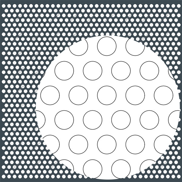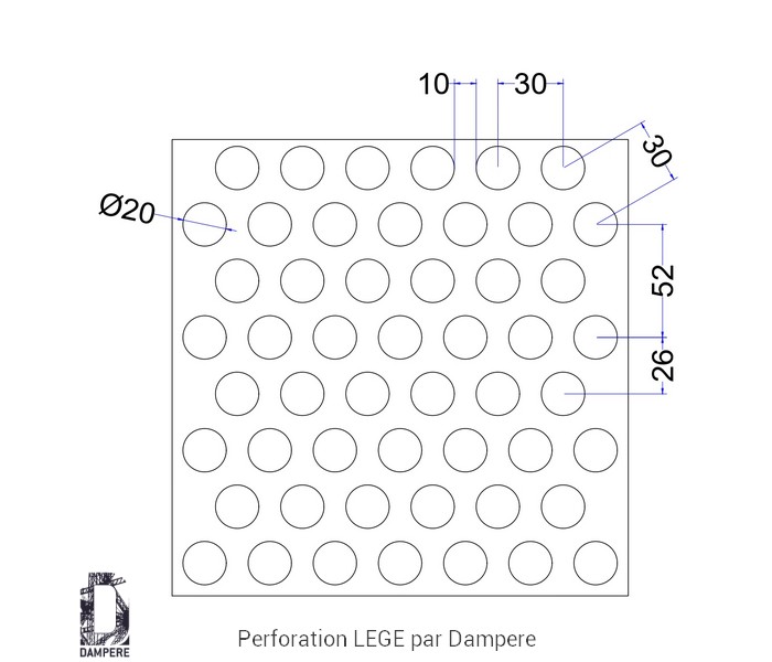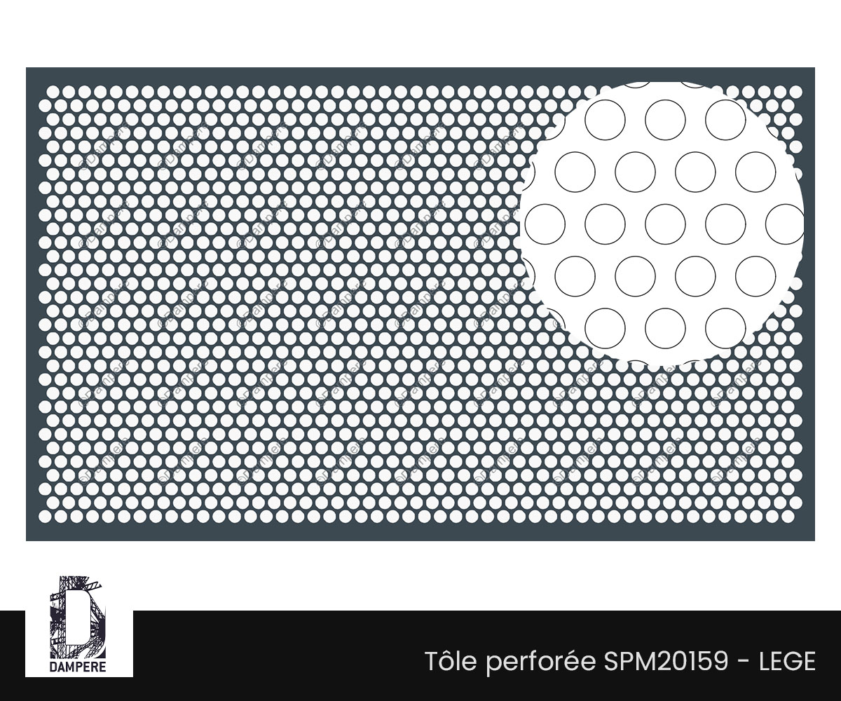 La tôle perforée R20T30 Lege propose une écriture visuelle aérée et lumineuse : des ronds de Ø 20 mm agencés en quinconce sur un pas constant de 30 mm. Sous la nomenclature Rv20-30, ce motif perforé atteint environ 40 % de vide, un niveau pertinent pour conjuguer passage d’air, apport lumineux et allègement perçu de l’enveloppe. Grâce à sa maille à disposition triangulaire en T, la répartition des ouvertures reste homogène et sans direction privilégiée : les ombres se déposent en tramage doux, et la surface, vue de loin, s’apparente à un voile métallique régulier.