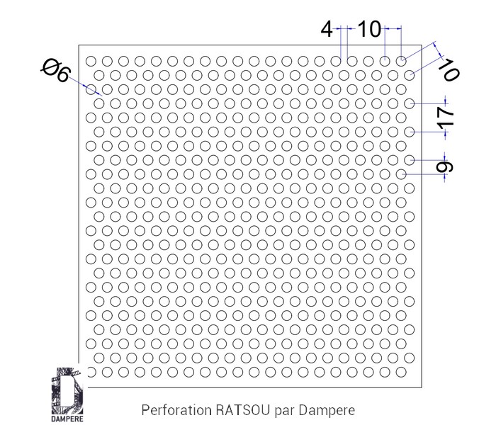 La tôle perforée R6T10 Ratsou propose une écriture fine et régulière : des petits ronds de diamètre Ø 6 mm agencés en quinconce sur un pas constant de 10 mm d'entraxe. Sous la désignation standard de perfo Rv6-10, cette géométrie perforée régulièrement délivre environ 32 % de vide, un ratio pertinent quand l’objectif est d’assurer un passage d’air utile, une transmission lumineuse mesurée et un rendu visuel homogène en protégeant des regards indirect. La maille triangulaire favorise une diffusion uniforme des ouvertures : le tramage d’ombres reste doux et peu directionnel par son effet de moirage; en lecture lointaine, la surface s’apparente à un voile métallique continu et apaisé, un mirage en métal. Le trou perforé de diamètre Ø 6 mm imprime une présence graphique discrète et très soignée. Selon la teinte appliquée, l’effet varie d’un rendu feutré sur tons sombres à une lecture plus nette sur finitions claires ou métallisé. Le choix du RAL lors du thermolaquage a une conséquence énorme. Le motif régulier en tôle perforé se prête à la décoration intérieure, capotages d’appareillage, écrans pour équipements CVC, cache radiateur et parements rapportés lorsque l’on recherche un compromis ventilation/éclairage avec une granularité visuelle fine. La Tôle perforée R6T10 avec T = 10 mm et D = 6 mm, les ponts de matière en ligne atteignent environ 4 mm (T – D). En diagonale de la maille triangulaire, la réserve minimale descend à près de 2,7 mm (√3/2 · T – D ≈ 8,66 – 6). Cette matière restantes sur le métal, réduite dans la direction oblique, impose une approche structurelle précise : • cette perforation en acier 1.5 mm, privilégier des formats non encadrés modestes entre 1.1 et 1.4 m²; • adjoindre un cadre porteur soudé/boulonné et/ou des profils de raidissement pour des panneaux plus vastes ; • en sites soumis à sollicitation, environnements urbains (chocs, vandalisme) ou pour grandes portées, viser 2 mm en épaisseur. • resserrer le pas de fixation et multiplier les points d’appui sur la charpente secondaire. Correctement établie, la tôle perforée R6T10 diffuse efficacement les efforts dans les deux axes et garantit une stabilité satisfaisante malgré des ligatures obliques courtes. Les trous de diamètre Ø 6 mm procurent un débit d’air appréciable tout en limitant la franchissabilité des doigts pour les enfants et l’introduction de petits objets, utile en zones accessibles au public. En acier galvanisé épaisseur 2 mm, la tôle perforée R6T10 se situe généralement entre 65 € et 102 €/m² autour de 100 m² de fourniture, selon l’épaisseur, la finition, la trame de pose, la présence de cadres/raidisseurs et le contexte de chantier. Un ajourage d’environ 32 % maintient une masse correcte par m² et favorise la rigidité globale ; la densité de perfo (trous rapprochés) peut augmenter le temps passé en production.