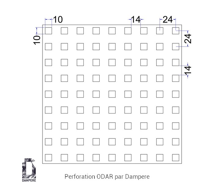 La tôle perforée C10U24 – Odar est caractérisée par ses trous carrés de 10 mm, disposés en trame linéaire droite, selon un entraxe régulier de 24 mm. Ce motif Qg10-24 offre une transparence de 17 %, ce qui en fait une solution parfaite pour des usages où la confidentialité, la sécurité physique et la résistance sont prioritaires. L’effet brise vue de la tôle est efficace. Avec 14 mm de matière pleine entre chaque ouverture, ce motif ajouré présente une très grande robustesse, même en plaques de grande dimension. Le carré de 10 mm permet de laisser passer un peu de lumière et d’air, tout en protégeant efficacement contre les regards, les projections, ou les intrusions. Parfait comme panneau antivol. La très faible transparence de la perfo C10U24 en fait une barrière visuelle efficace pour des clôtures de commissariats de police, casernes, établissements de justice, prison, centres de rétention, hôpitaux psychiatriques, zones protégées contre le vol ou la délinquance. La tôle perfo C10U24 préserve la confidentialité, empêche l’accès des regards extérieurs tout en laissant une aération naturelle suffisante pour éviter l’effet de mur plein en béton. Cette tôle perforée occultantes est parfaitement adaptée aux zones inférieures de façade ou aux parements de soubassement de bardage dans bâtiments publics ou tertiaires, immeubles de logements sociaux de type HLM ou résidences collectives, locaux commerciaux en pied d’immeuble en pleine ville. Sa protection visuelle élevée évite le regard direct tout en maintenant une esthétique sobre et rythmée. Son design carré en trame droite est compatible avec une architecture minimaliste ou fonctionnelle. Idéal pour la protection basse de vitrines en volet rabattables. Son taux de vide réduit protège efficacement contre les jets de pierre, les chocs violents et le vandalisme, notamment dans les zones à fort risque.