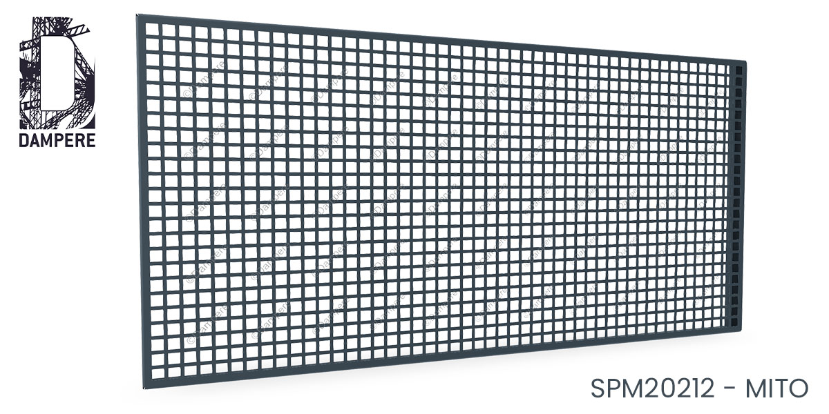 La tôle perforée C18U24 – Mito impose sa présence avec sobriété et efficacité. Composée de trous carrés de 18 mm de côté, alignés en trame droite selon un entraxe de 24 mm, elle dessine une grille géométrique rigoureuse nommée Qg18-24, offrant une transparence de 56 %, équilibré entre transparence et disposition de trou.