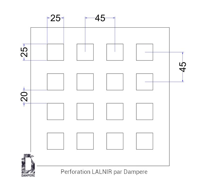 La tôle perforée C25U45 – Lalnir incarne une esthétique imposante au service de la protection et résistance. Composée de trous carrés de 25 mm de côté, alignés avec régularité selon un entraxe de 45 mm, elle forme un motif orthogonal désigné sous la référence Qg25-45, avec un taux de transparence de 30 %. Ce pourcentage de vide équilibré, associé à une large matière résiduelle de 20 mm entre chaque ouverture, confère à la tôle une excellente tenue mécanique, supérieure à celle des modèles plus ajourés de type C10U14 ou C16U20.