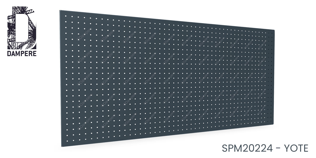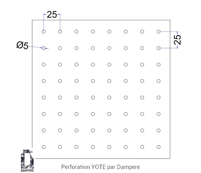 La tôle perforée R5U25 Yote propose une écriture visuelle très fine et régulière : des ronds perforés de Ø 5 mm agencés en alignement orthogonal sur un pas constant de 25 mm. Sous la désignation de nomenclature standard de perforation Rg5-25, cette géométrie perfo délivre environ 3 % de vide, un niveau très bas lorsqu’il s’agit de privilégier l'occultation, une transmission lumineuse limitée et une micro-ventilation contrôlée. La grille de perforation orthogonale produit une répartition directionnelle des ouvertures : la pénombre dessine un léger quadrillage discret; en lecture lointaine, la surface se perçoit presque comme une peau pleine, à peine ajourée. Le trou perforé de diamètre Ø 5 mm confère une présence graphique très mesurée, quasi ponctuelle. Cette tôle d'oc ultation est indiquée pour des parements rapportés, capotages d’appareillage, habillages d’espaces techniques, écrans de protection et faux-plafonds lorsque l’on recherche avant tout la confidentialité visuelle, une esthétique apaisée et une aération minimale. La tôle perforée R5U25 avec U = 25 mm et D = 5 mm, les ponts de matière atteignent environ 20 mm dans les deux directions. Cette réserve de matière très confortable se traduit par une rigidité élevée et une excellente stabilité en acier 1.5 mm, des formats non encadrés de taille significative sont envisageables jusqu'à 1.5 m² sans problème. Les trous perforés de diamètre Ø 5 mm limitent fortement les vues directes, l’éblouissement et la pénétration d’objets, avantageux en zones accessibles au public que l'on doit occulter complètement tout en laissant passer un minimum d'aération. En acier galvanisé épaisseur 1.5 mm, la tôle perforée R5U25 se situe généralement entre 42 € et 75 €/m² autour de 100 m² de fourniture, selon l’épaisseur, la finition, la trame de pose. Une transparence faible de 3 % maintient une masse par m² élevée, favorable à la rigidité et à la perception d’une peau quasi pleine, mais attention au poids lors de l'installation sur chantier.