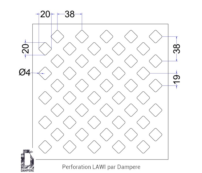 La tôle perforée CD15M38 – Lawi propose une écriture géométrique décorative et apaisée : des trous carrés de 15 mm aux angles adoucis, disposés en quinconce (maille à répétition triangulaire) sur un module de 38 mm. Dans ce moucharabieh perforé géométrie de perfo, le vide opérationnel se situe autour de 19 %, un niveau mesuré lorsqu’il s’agit d’assurer un passage d’air utile, une transmission lumineuse maîtrisée et un rendu visuel soigné. L’orientation “sur pointe” confère au motif une texture élégante : à distance, la surface se lit comme un voile métallique régulier ; de près, les facettes arrondies adoucissent les ombres et évitent la dureté d’un carré strict.