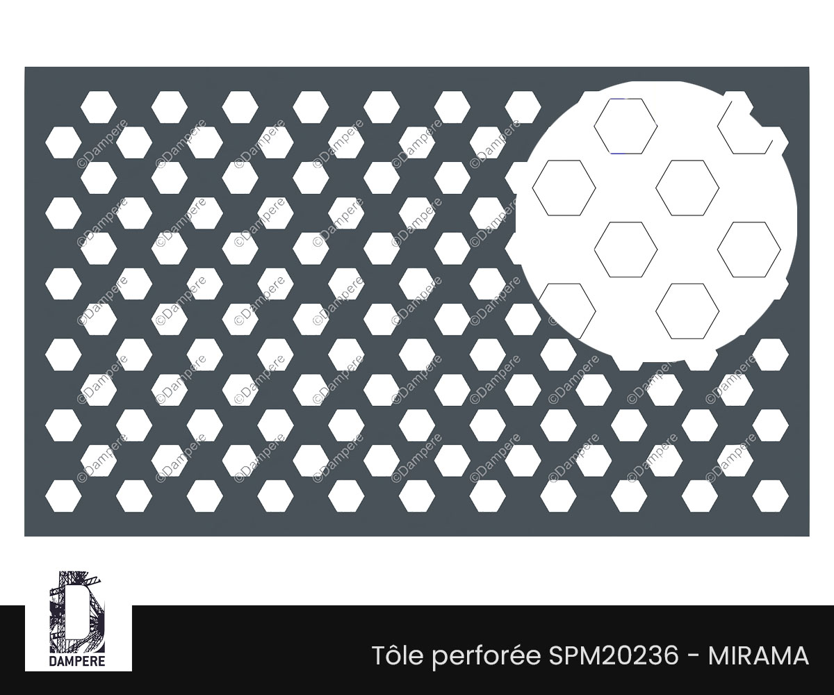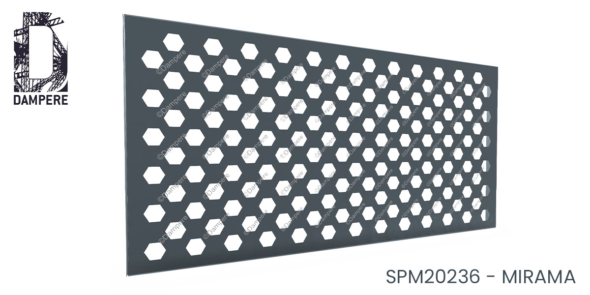 La tôle perforée en nid d’abeille Mirama offre une signature contemporaine, plus “architecturée” qu’une grille orthogonale : brise-vues décoratifs, parements rapportés, clôtures urbaines, habillages d’espaces techniques, caissons et capotages, claustras intérieurs, faux-plafonds à maille graphique. Tôle perforée À 15 % de vide, la lecture de l’arrière-plan est fortement calmée ; la perfo convient donc aux contextes recherchant confidentialité visuelle et écriture géométrique nette.