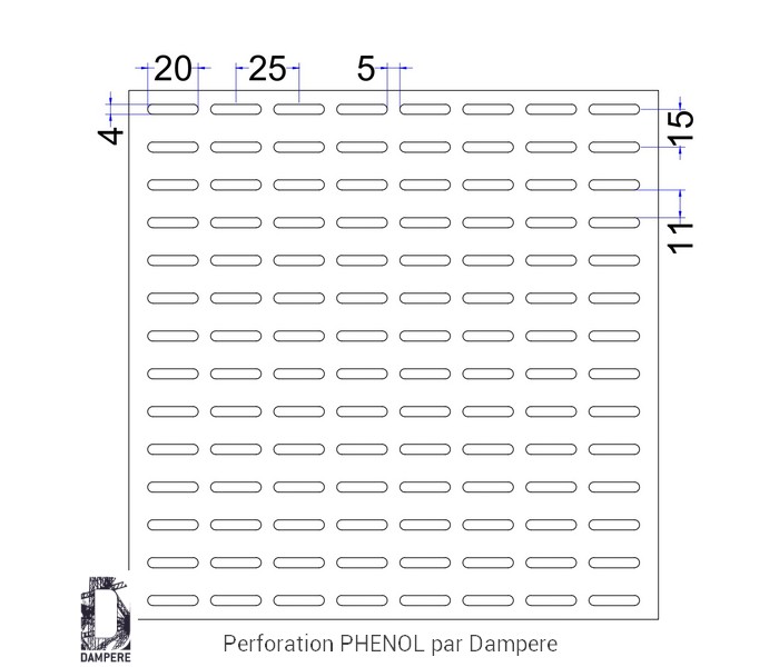 La tôle perforée LR 4×20 U 15×25 – Phenol propose un graphisme de grille allongée; par des ajours oblongs de 4×20 mm, disposés en alignement orthogonal parfait sur un pas de 15 mm dans la petite direction et 25 mm dans la grande. Dans cette géométrie de grille perforée, le vide est d’environ 18 %, niveau adapté lorsque l’on souhaite combiner passage d’air utile, apport lumineux ajusté et lecture visuelle calme. À la différence d’une grille perforée en maille décalée de type "z", la grille en ligne produit un quadrillage de type "U" demeure très lisible : les ombres s’organisent en bandes régulières, avec un effet de grille orthogonale plus marqué selon l’orientation. Le trou perforé en oblong de dimension 4×20 mm imprime une signature élégante et directionnelle. Posé à l’horizontale, il étire visuellement les façades et allège les volumes du Bâtiment; à la verticale, il accentue la perception de hauteur de l'immeuble. La tôle perforée Phenol avec un entraxe en grille orthogonal en U 15×25 mm et un vide par ajour de 4×20 mm, les ponts de matière atteignent environ 11 mm dans la petite direction (15 – 4) et 5 mm dans la grande (25 – 20). La trame orthogonale confère un comportement légèrement plus directionnel qu’une maille décalée ; la ligature longitudinale de 5 mm exige néanmoins de la rigueur : • en acier 1,5 mm, privilégier des formats non encadrés de taille de 1.3m² selon l’exposition ; • pensez à orienter de préférence les plis perpendiculairement à la grande longueur des oblongs pour maximiser la tenue de la tôle perforée ; La tôle perforée avec un vide de 18 % procure une micro-ventilation régulière et une transmission lumineuse tempérée, tout en limitant nettement les vues directes depuis l'extérieur. Les fentes 4×20 mm réduisent l’introduction d’objets et la préhension au doigt, utile en zones accessibles. En faux plafond technique, l’association de la tôle perforée avec un voile acoustique et un absorbant transforme la grille perforée en parement technique performant. La tôle perforée en acier galvanisé épaisseur 1,5 mm se vend à un prix entre 52 € et 90 €/m² autour de 100 m² de métal.