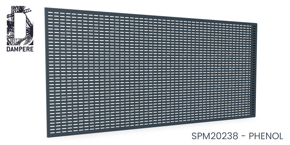 La tôle perforée LR 4x20 U 15x25 - Phenol s’utilise principalement pour le remplissage de garde-corps, les grilles de séparation ou les habillages de grille de ventilation ainsi que de cache radiateur. Ses trous perforée en forme d'oblongs alignés limitent le passage du regard dans une direction précise, produisant un effet d’occultation progressif selon l’angle d’observation. Ce comportement optique fait de la tôle un excellent matériau pour préserver l’intimité des balcons, terrasses, des machines techniques tout en garantissant un passage d’air suffisant sans voir la construction mécanique. La faible transparence de 18 % procure à la tôle LR 4x20 U 15x25 une présence pleine et protectrice. La proportion importante de métal lui confère une résistance mécanique élevée, adaptée aux environnements soumis au vandalisme, aux impacts urbains et aux sollicitations extérieures répétées. Cette robustesse en fait un matériau privilégié pour les clôtures urbaines, les soubassements de façades ou les enveloppes de locaux techniques et Local OM. La régularité du motif et la précision de l’alignement assurent une lecture visuelle nette, sans vibration optique ni désordre graphique. Donc facile à intégrer dans un projet architectural. La tôle perforée Phenol s’impose également comme un matériau d’habillage fonctionnel : caches de ventilation, parements de gaines, clôtures techniques ou protections d’équipements. Son motif en ligne évoque la précision industrielle, tout en s’intégrant aisément dans des compositions architecturales sobres et rythmées. L’architecte urbaniste y trouve une matière rigoureuse et directionnelle, apte à structurer les façades par la répétition maîtrisée du motif. Le métallier y voit une tôle perforée solide, simple à plier et à fixer, parfaitement adaptée aux systèmes modulaires. L’agenceur y reconnaît une surface de grille filtrante et graphique, qui délimite les espaces sans les fermer.
