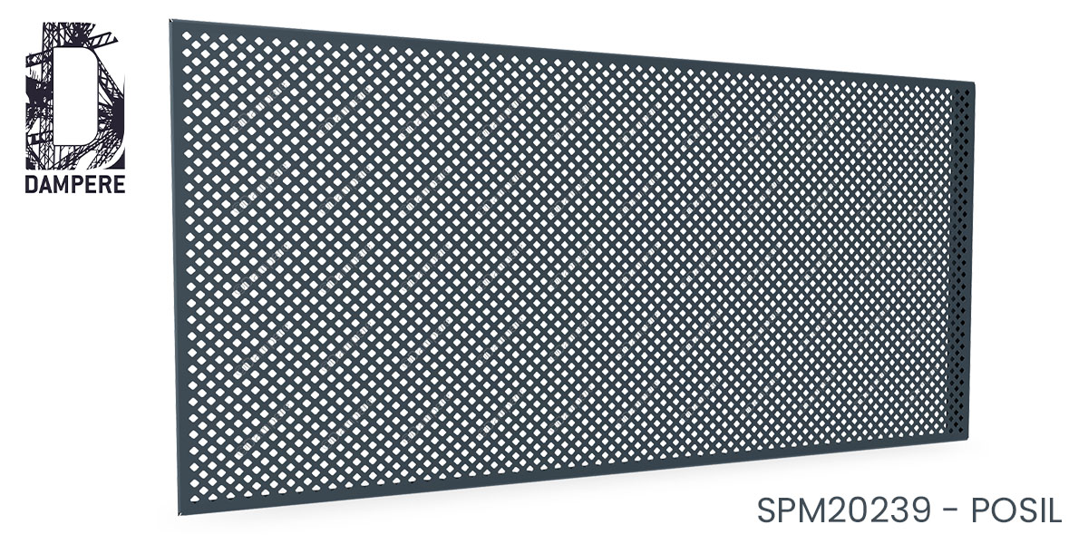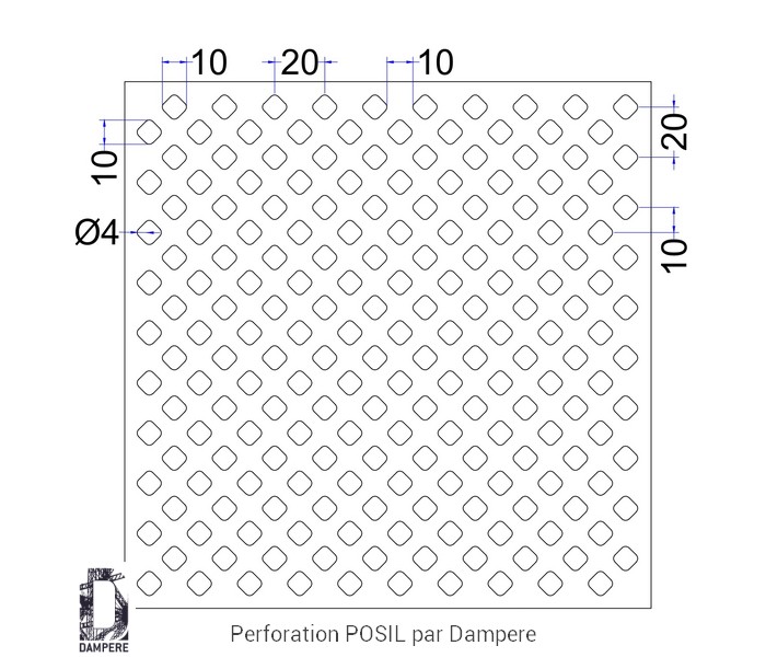 La tôle perforée CD8M20 – Posil propose une écriture géométrique précise et décorative : des trous carrés de 8 mm aux angles adoucis, disposés en quinconce à 45° “sur pointe”, sur une maille à répétition triangulaire de 20 mm. Dans cette géométrie de perfo, le vide opérationnel se situe autour de 20 %, un niveau mesuré lorsqu’il s’agit d’assurer un passage d’air utile, une transmission lumineuse maîtrisée et un rendu visuel soigné. L’orientation en pointe de diamant ou disposition carré sur pointe, crée une texture graphique élégante ; à distance, la surface se lit comme un voile métallique régulier, tandis que de près, les facettes arrondies adoucissent les ombres et évitent la dureté d’un carré strict.